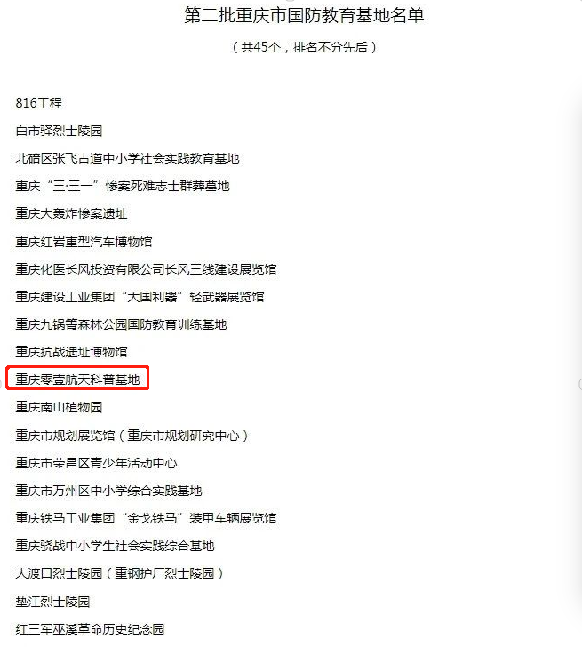 近日,重慶市人民政府公布了第二批重慶市國防教育基地名單,位于兩江新區的重慶零壹航天科普基地成功入選。